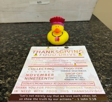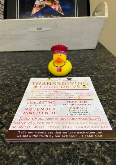 Ducks on a Mission is a nonprofit based in Roanoke, Virginia that provides support to families struggling with food insecurity around Easter and Thanksgiving